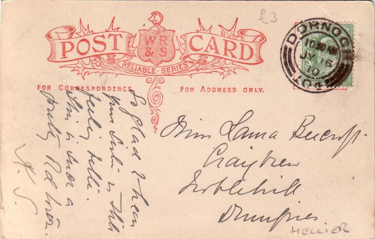 Reverse side of postcard from the Basil Hellier collection, showing Castle Street, Dornoch