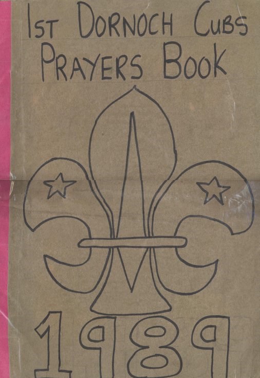 Scrapbook containing cubs' prayers, divided into four sections: 'Thank You'; 'Sorry'; 'Look What We Did' and 'Please Help'