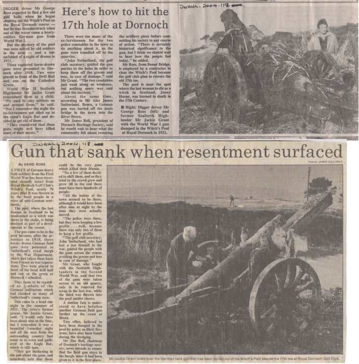 Newspaper article and photographs of German field gun from first World war recovered from Witch's pool on the Dornoch golf course by Mr Jackie Grant; one photo of gun being recovered, the second shows gun cleaned up. 2 copies. Colour photographs of the recovered gun are at picture #14111 et seq