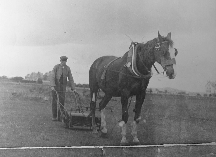 Judging by the positions of the Grange and the Station Hotel in the above photograph, the horse-drawn mower is on what is now the 1st hole of the Struie. If the date (1910) in the caption is correct, the hole was then the 13th of the main course as reconstructed in 1904 by the great John Sutherland, with considerable input from the legendary JH Taylor.