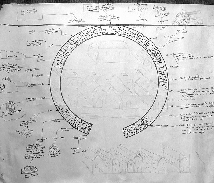 Handwritten circular diagram, on the back of an Ordnance Survey one inch to one mile map of Dornoch, showing a succession of events in the history of the Skelbo Estate, starting from the Mesolithic period 8000BC to 2001-2002 break-up of the estate.