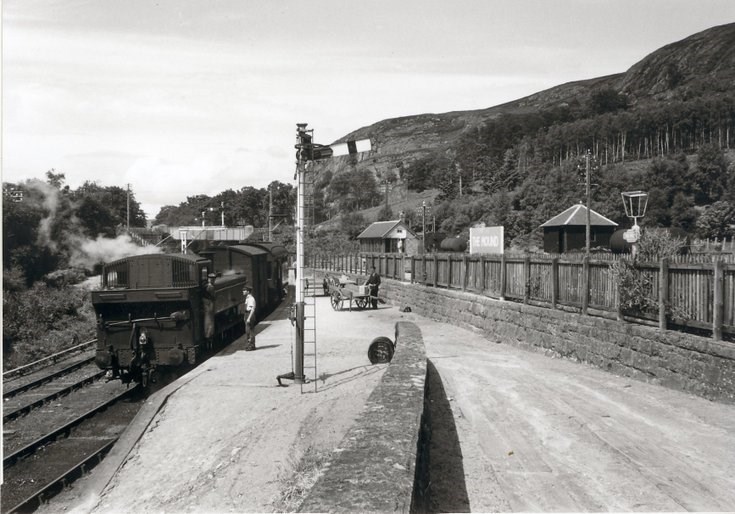 Seventh in a set of 13 monochrome photographs of the Dornoch Light Railway © www.transporttreasury.co.uk and displayed with permission. Photograph shows a saddle tank locomotive with goods wagon and passenger coach at the Dornoch line platform at The Mound Station (possibly this is the same train as in picture #11185). The main line platform at the Mound is behind the wall with fence to the right, with the Mound signal box in the centre background.Seventh in a set of 13 monochrome photographs of the Dornoch Light Railway © www.transporttreasury.co.uk and displayed with permission. The main line platform at the Mound is behind the wall with fence to the right, with the Mound signal box in the centre background.