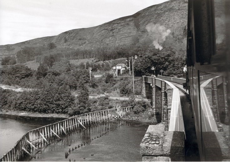 Twelfth in a set of 13 monochrome photographs of the Dornoch Light Railway © www.transporttreasury.co.uk and displayed with permission. Photograph taken from a passenger coach, similar to the previous two images with the train about to cross the railway bridge at the Mound , wth the wooden barrier to the Loch Fleet sluice gates on the left. This is the third of a series of 3 photographs getting closer to the Mound station.