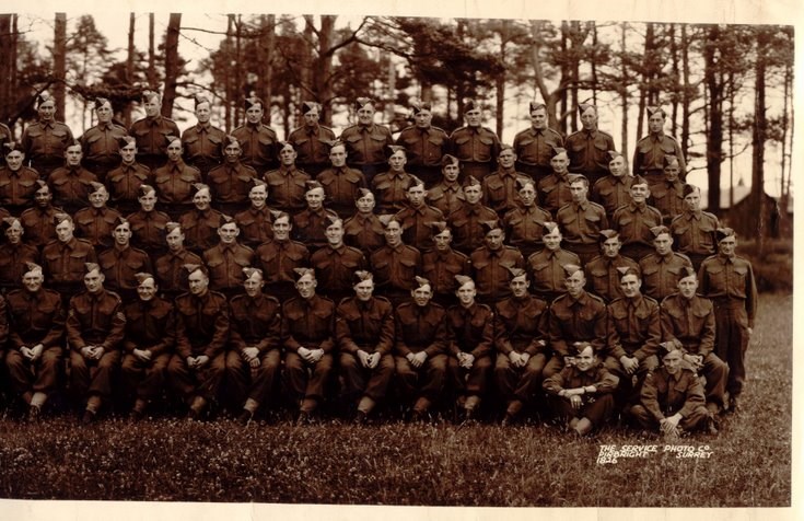 Third of a set of three monochrome photographs showing the right third of a large group photograph of No 26 Company Canadian Forestry Corps taken in Scotland in 1943. Possibly taken at Camore Wood. This image shows the right third of the group and may assist in identifying individuals.
