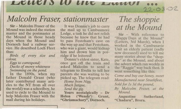 Extract from 'Letters to the Editor' published in the Nothern Times March 22, 2002 with memories of Malcom Fraser Mound Stationmaster and Postmaster. He was obvioulsy a man of verse and with the first letter recalling his description of Loch Fleet and a telegram he composed to alert parents to the arrival of their daughter and the second reproducing an advert for his honey he submitted to the 'Raggie'.