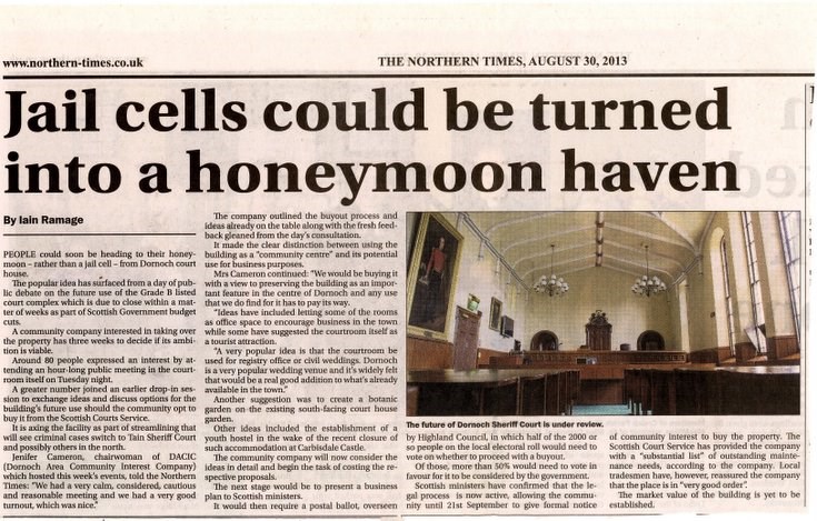 Copy of an article, published in the Northern Times of August 30, 2013, with title 'Jail cells could be turned into a honeymoon haven' recording proposals reaching the Dornoch Area Community Interest Company concerning possible future use of the Dornoch Courthouse. Among the various suggestions was a popular idea for the courtroom to be used for registry office or civil weddings. The community company will be considering all ideas in detail prior to conducting a postal ballot to decide whether to proceed with a community buyout.