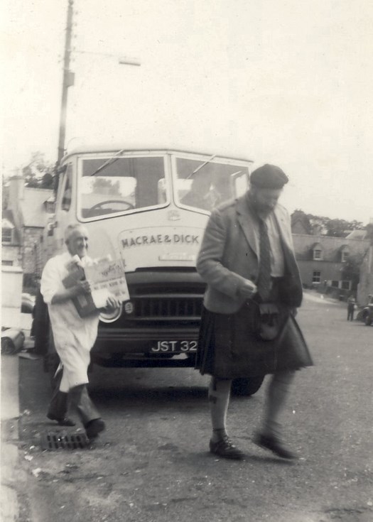 Monochrome photograph of the actor James Robertson Justice, a resident of Spinningdale, crossing the High Street, Dornoch followed by Duncan MacGregor owner of Weir's shop. A Macrae and Dick lorry is parked outside the shop.