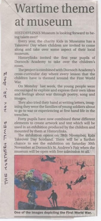 An article published in the Northern Times of Friday 22 November 2013, with the title 'Wartime theme at museum'. The article, with a colour photograph of one of the wartime images produced, records the invitation extended to Dornoch Academy pupils to take over the Children's room at Historylinks Museum as part of 'Takeover Day' promoted by the charity Kids in Museums. In addition to producing images, pupuls created the text to accompany their exhibition at Historylinks.