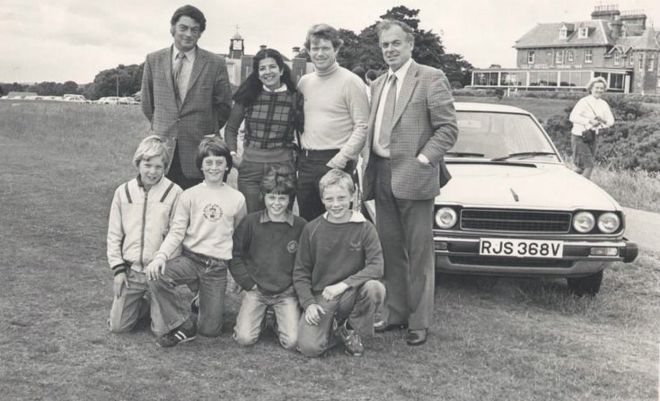 Monochrome group photograph recording Tom Watson's visit to the Royal Dornoch. Tom Watson and his wife, with the RDGC Captain (the late Dr John Macleod) and the Secretary (the late Ken Murray). and four boys The Royal Dornoch Club House and the Royal Golf Hotel are in the background.