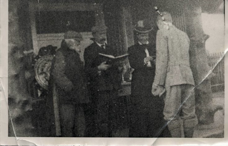 Monochrome photograph of the presentation of prizes by Mrs Carnegie at the Royal Dornoch Annual Open Tournament. Andrew Carnegie in on the left and the magnificent Carnegie Shield can be seen in the background. The presentation of prizes was in the old golf pavilion, later used as a professionals shop until it was demolished in 1972. This photograph is creased and grainy. (see another photograph of this event at picture #252 )