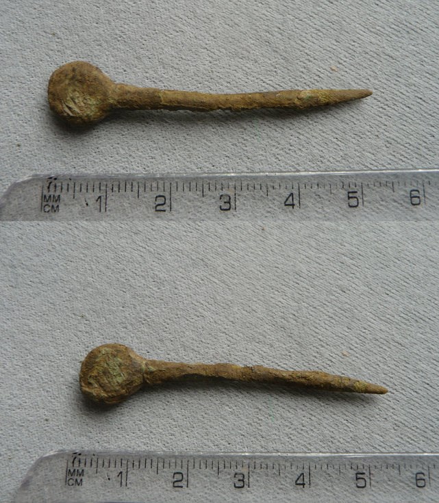 Copper alloy pin with a flat circular head; although this type does not conform to the known types of the Early Historic period in Scotland (and Ireland) dress pins continue into the medieval period and this might be an unusual form. Length 51mm [Grid Ref: NH 70688 88540]