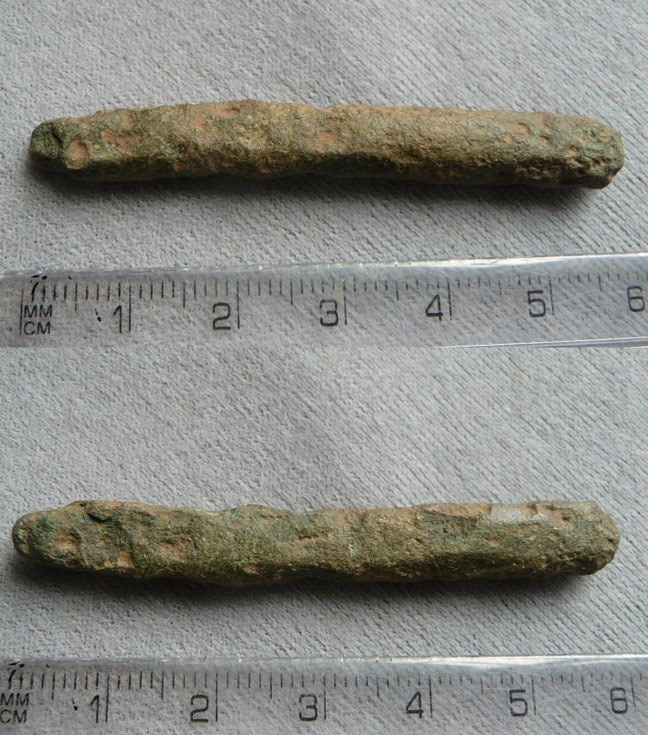 A small copper alloy ingot of undiagnostic form. 58x8mm Weight 8.7g [Grid Ref: NH71668 89416]