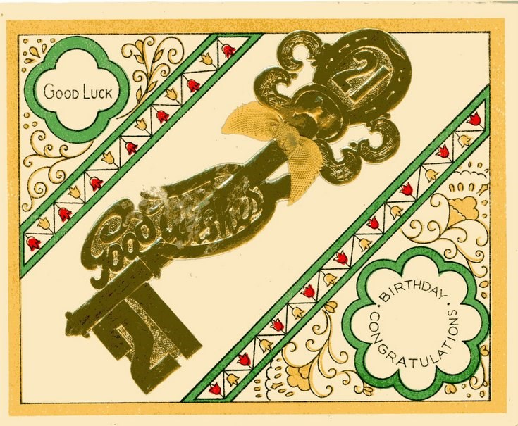 A 21st birthday greetings with a golden key good wishes key and corner decoration conveying 'Good Luck' and 'Birthday Congratulations' . The card was sent to Willie Mackay from Jessie and is one of the set of greetings cards and telegrams contained in the biscuit/shortbread tin.