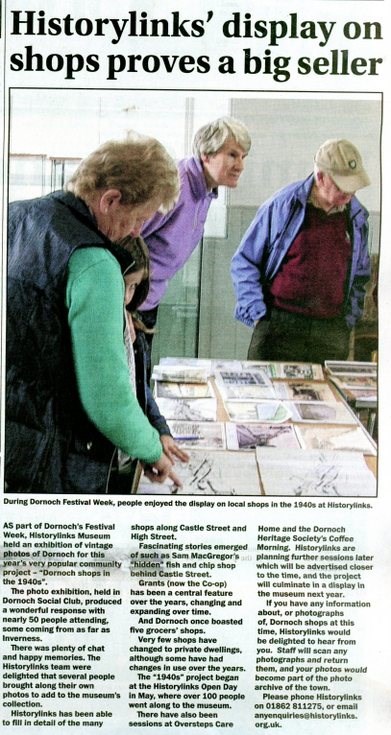 Extract from the Northern Times of 24th. July 2015 with colour photograph noting the successful exhibition held at Historylinks museum on the topic of "Dornoch Shops in the 1940s" held during Dornoch Festival Week.