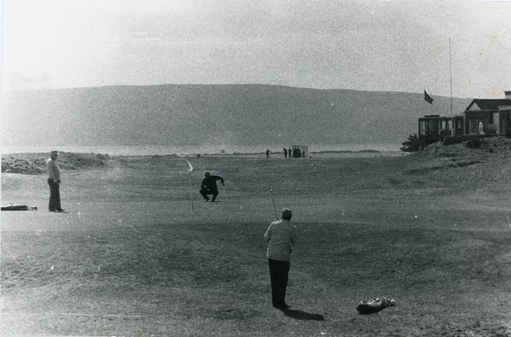 Monochrome photograph of a golfer chipping to the 1st hole with the clubhouse at right background. The profile of the clubhouse, and the absence of the professional's shop behind the first tee dates this photograph to the 1970s.