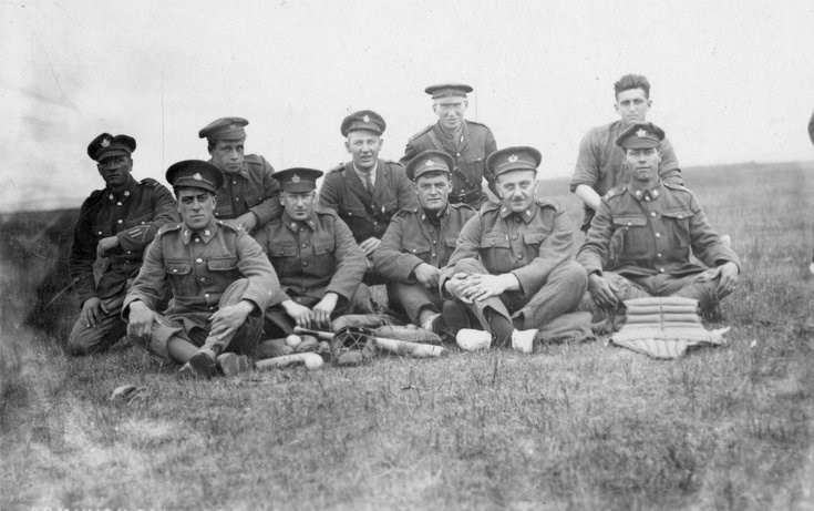 Monochrome photograph showing ten men in uniform with caps on seated on grass with sports equipment at the Dominion Day celebrations. The picture is annotated at bottom left "Dominion Day in Dornoch 1918" and at bottom right "A M Gibson." The reverse is printed as a postcard with 'communication' and 'address only' spaces.