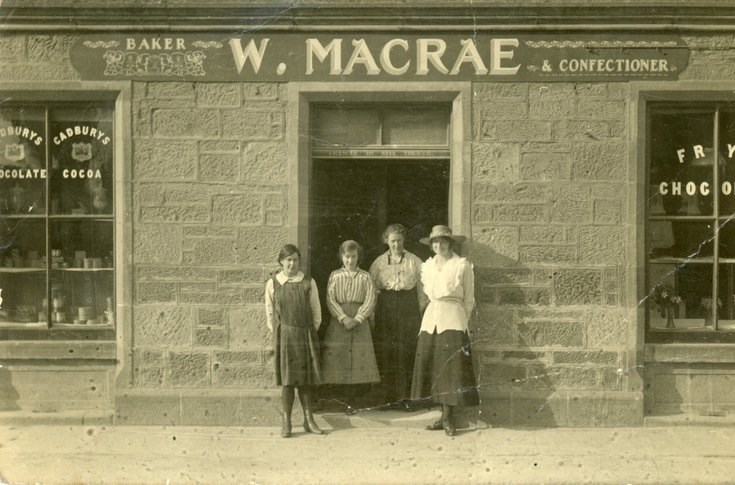 Monochrome photograph of the shopfront of W. Macrea, Baker and Confectioner, in Castle Street, with four women posing at the doorway. The back is printed as a post card with spaces for communication and address. Another photograph of the shop, with possibly the same four women at an earler date, is at 2016.002.42.