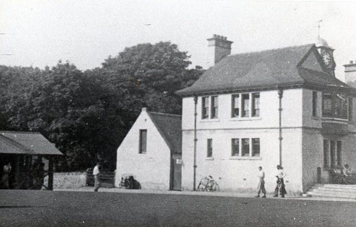 Monochrorme photograph of the southern side of the Royal Dornoch clubhouse c 1940 with four people outside and bicycles leaning against the wall