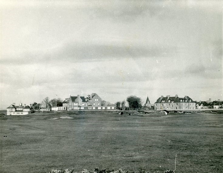 Monochrome photograph providing a view of neighboring buildings of the Royal Dornoch Golf Club. From left to right: the Royal Dornoch clubhouse, Royal Golf Hotel, Dornoch Cathedral, and Ross House.
