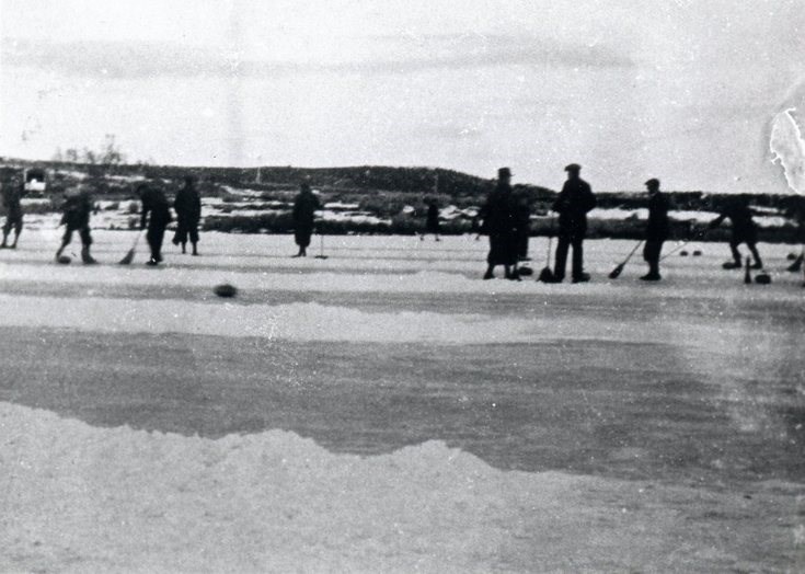 Monochrome photograph showing a good gathering of participants in curling on Loch-an-Treel