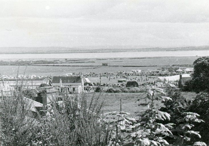 Monochrome photograph of the venue of the Dornoch Highland Games, the sports field in the Meadows, Dornoch