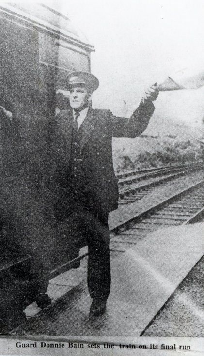 Monochrome photograph of Donnie Bain on the last train from Dornoch Station