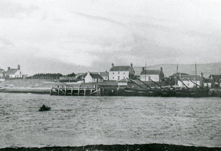 Monochrome photograph of the pier, with six fishing vessels on the seaward side, and the surrounding houses of Little Ferry, on the northern side of the Loch Fleet estuary