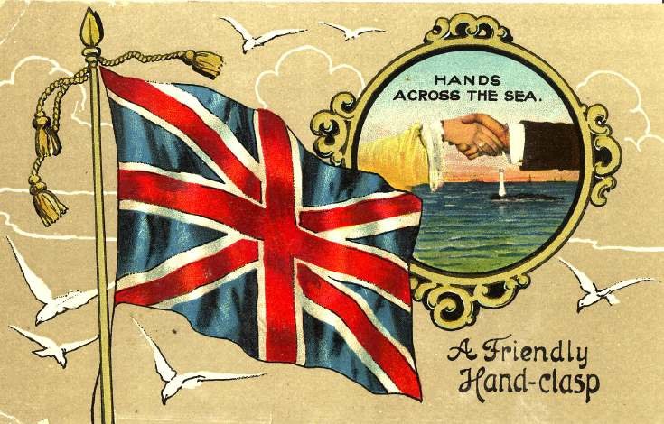 Postcard addressed to George Gordon, Skibo Farm, postmarked Vancouver Mar 23 1912. Colour picture of Union Jack with hands clasped across the sea. From Robbie.