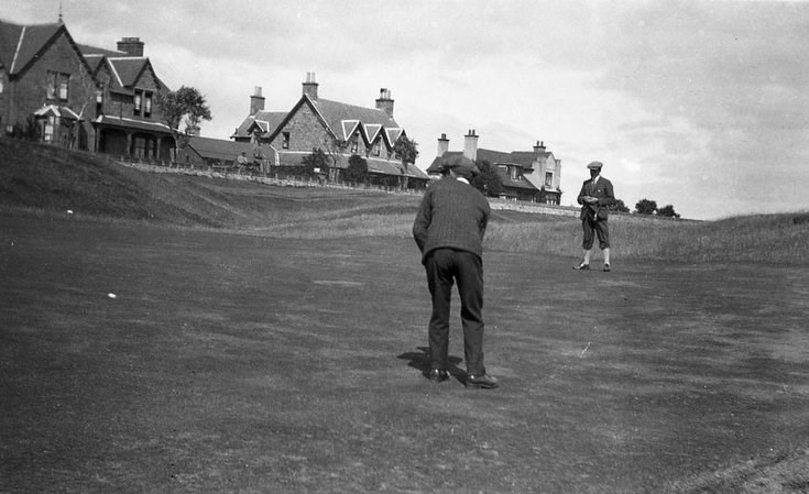 From the ‘Gillespie Collection’ of monochrome prints from glass photographic plates, first of a pair of photographs showing golfing partners putting with the houses of Grange Road in the background. c. 1920.