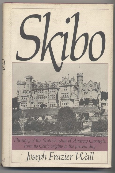 Hardcover book of 192 pp entitled 'Skibo' by Joseph Frazier Wall, "The story of the Scottish estate of Andrew Carnegie from its Celtic origins to the present day" published by Oxford University Press in 1984 ISBN 0-19-503450-3 and printed in the United States of America. It is dedicated "For Margaret Carnegie Miller Gracious and Good Lady of Skibo. This is her castle - her book". The mauve linen hard cover is embossed in gold lettering on a black background 'Skibo' with gold lettering 'Wall' and 'Oxford' on either side. The paper cover has a monochrome photograph of the south aspect of Skibo Castle, with a colour photograph of Skibo by Mrs Andrew Carnegie facing the title page and other colour and monochrome photographs within the six chapters covering the life of the estate to 1982, including a colour photograph at page 54 of the Dornoch Pipe Band performing at Skibo Castle in the Summer of 1980. The inside of the dust cover shows the original 1984 price of $17.95