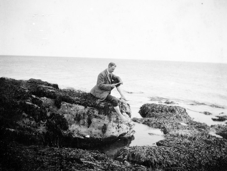 Monochrome photograph, from the Grant family albums, showing a gentleman, with shoes and socks off, sitting on the rocks at Dornoch beach