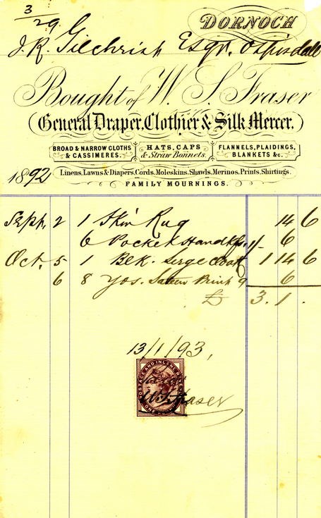 Copy of receipted invoice from W.S. Fraser, draper, Dornoch, to J.R. Gilchrist, for various items, dated 1892