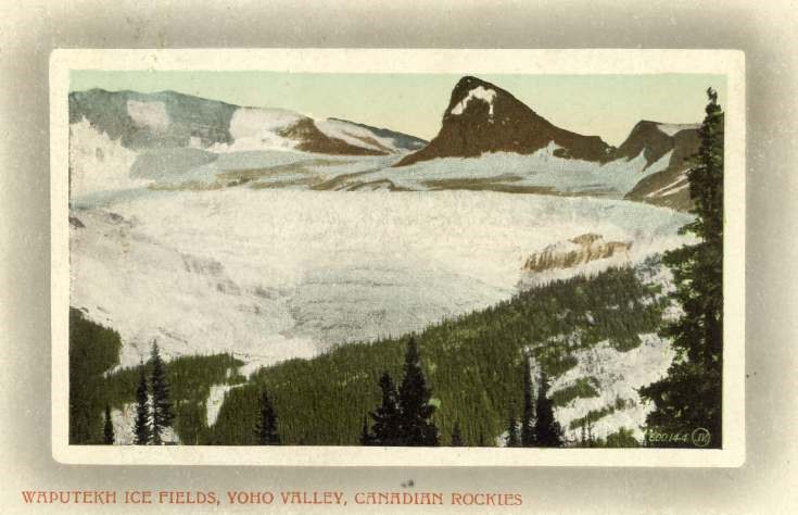 Postcard addressed to George Gordon, The Bothy, Skibo Farm, postmarked Strathmore (Canada) Sep 3 1911. Colour picture of the Waputekh ice fields, Yoho Valley, Canadian Rockies. From A Tavish.