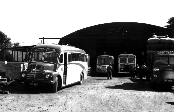 From the Sinclair collection, a monochrome photograph showing single deck buses and, on the right a lorry carrying bales with a partly obscured display board on its cab 'Buy Lochclash Silver Winch ...."