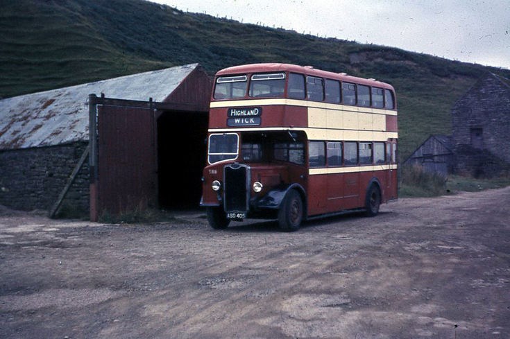From the Sinclair collection, a colour photograph of a double deck Highland bus in red and white livery at the bus garage in Dunbeath, It bears a destination display Wick