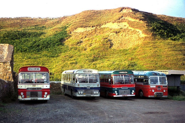 From the Sinclair collection, a colour photograph of a four coaches illustrating four styles of Highland bus livery at the bus garage in Dunbeath. The destination display on three of the coaches is Dunbeath.