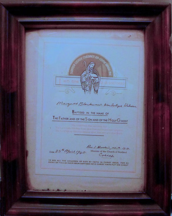 A framed certificate recording the baptism of Margaret Blackwood MacIntyre Wilson by the Reverend I Martin, M.A. B.D, Minister of the Church of Scotland, Creich on 25th April 1940. The certificate is enclosed in a glazed dark wood frame