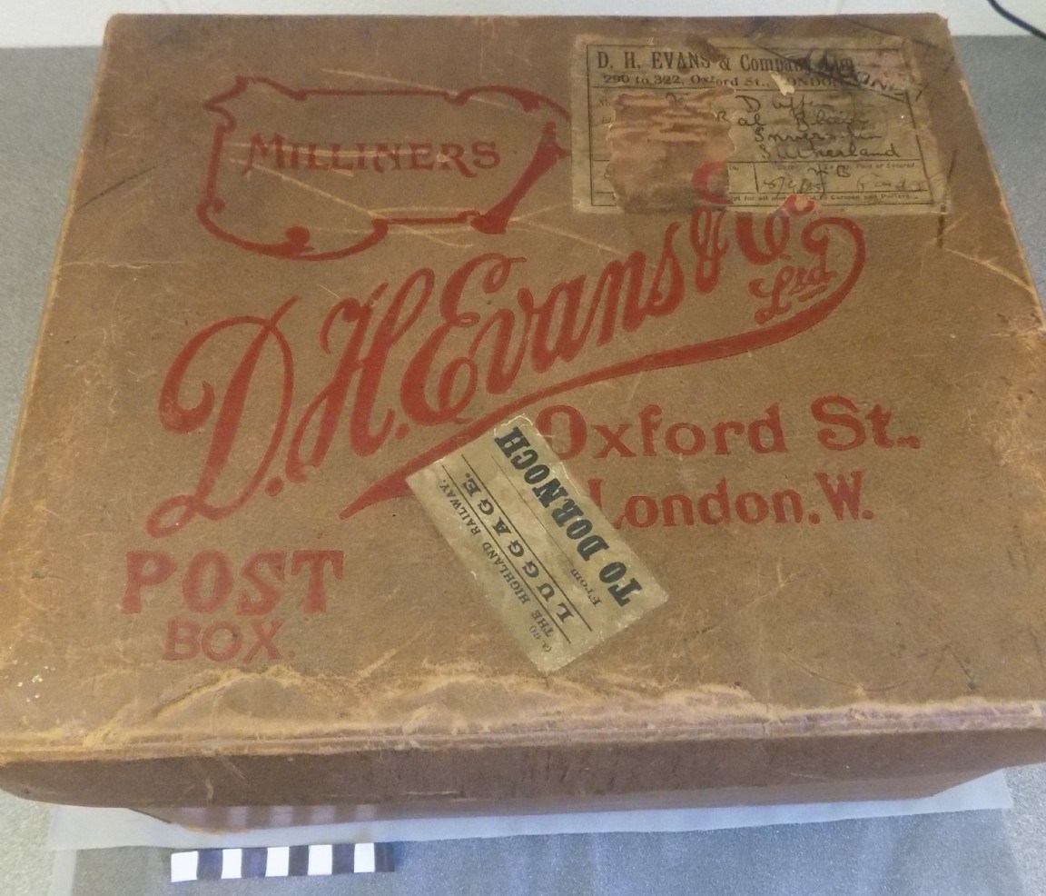 A D. H. Evans, Oxford Street, London W, Milliners Post Box which belonged to Mrs D McCulloch, 4 Carnaig Street, Dornoch. The box has an original label at top right, partly removed, with an Invershin, Sutherland address and bearing a hand written date "8/6/25". There is a second Highland Railway Luggage label for delivery to Dornoch.