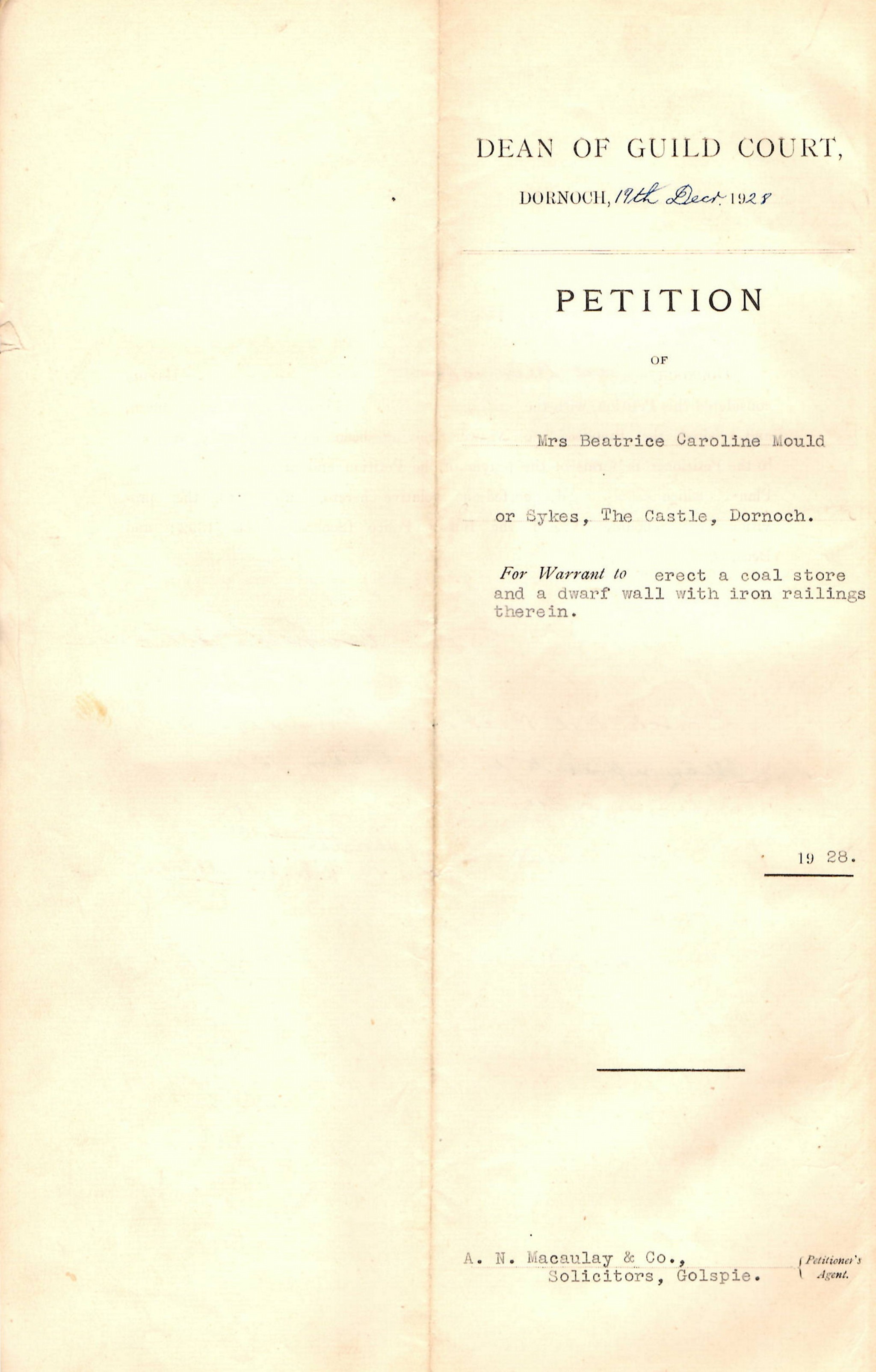 Dean of Guild Court Dornoch Petition dated 19th December 1928. This folded document relates to the Petition of Mrs Beatrice Caroline Mould or Sykes for a warrant for the erection of a coal store and a dwarf wall with iron railings at The Castle, Dornoch. A copy of the petition was served on one respondent. No objections were received and the warrant was granted.
