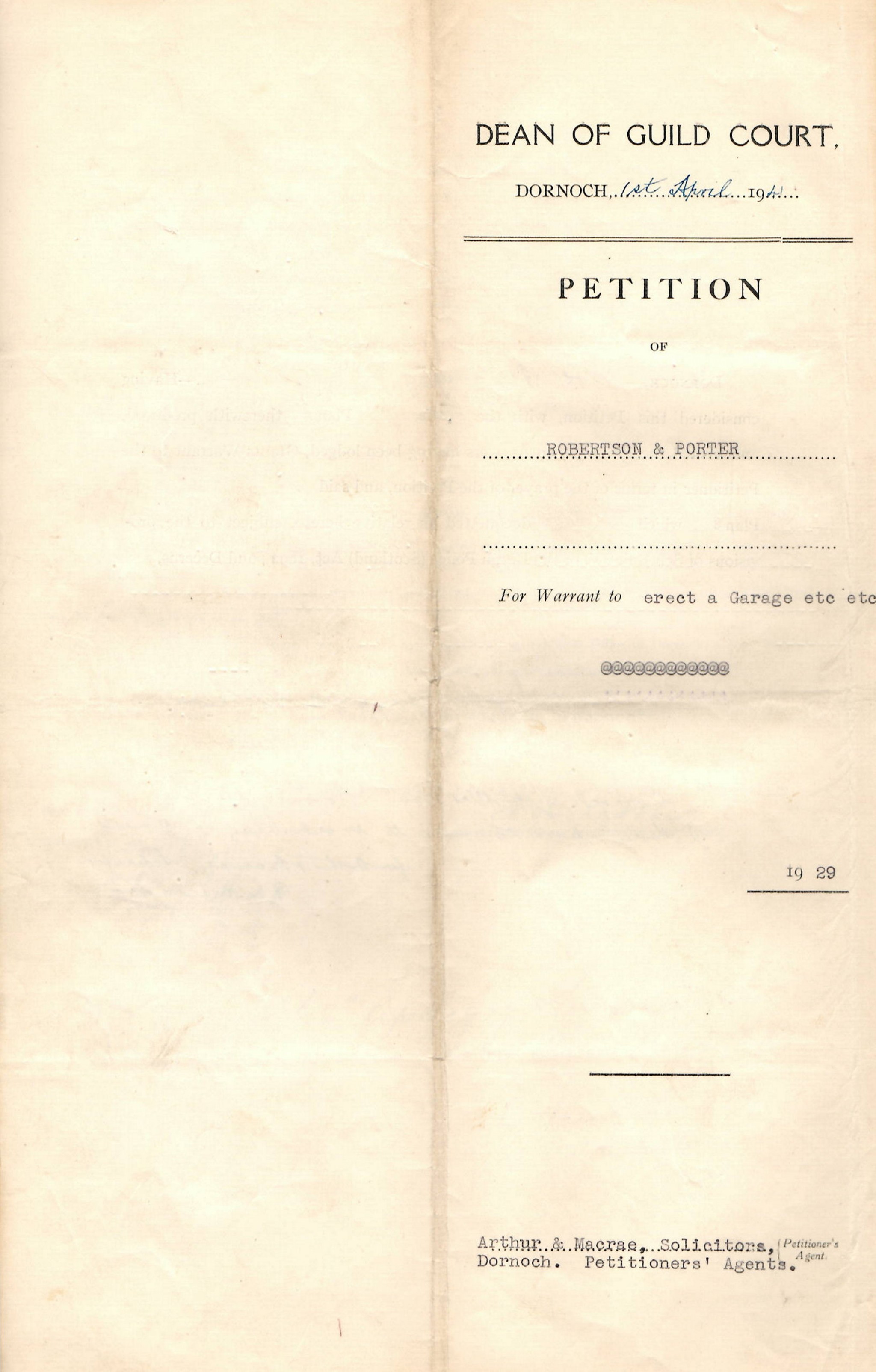 Dean of Guild Court Dornoch Petition dated 1st April 1941. This folded document relates to the Petition of Robertson & Porter, County Garage, Dingwall for a warrant for the erect garage at Meadows Road, Dornoch, a small garage store, alter an existing building to become a dwelling house and office, erect 3 petrol pumps, reconstruct the site entrance from Castle Street and connect the drainage system to the town sewer. Five respondents were named. No objections were received and the warrant was granted.