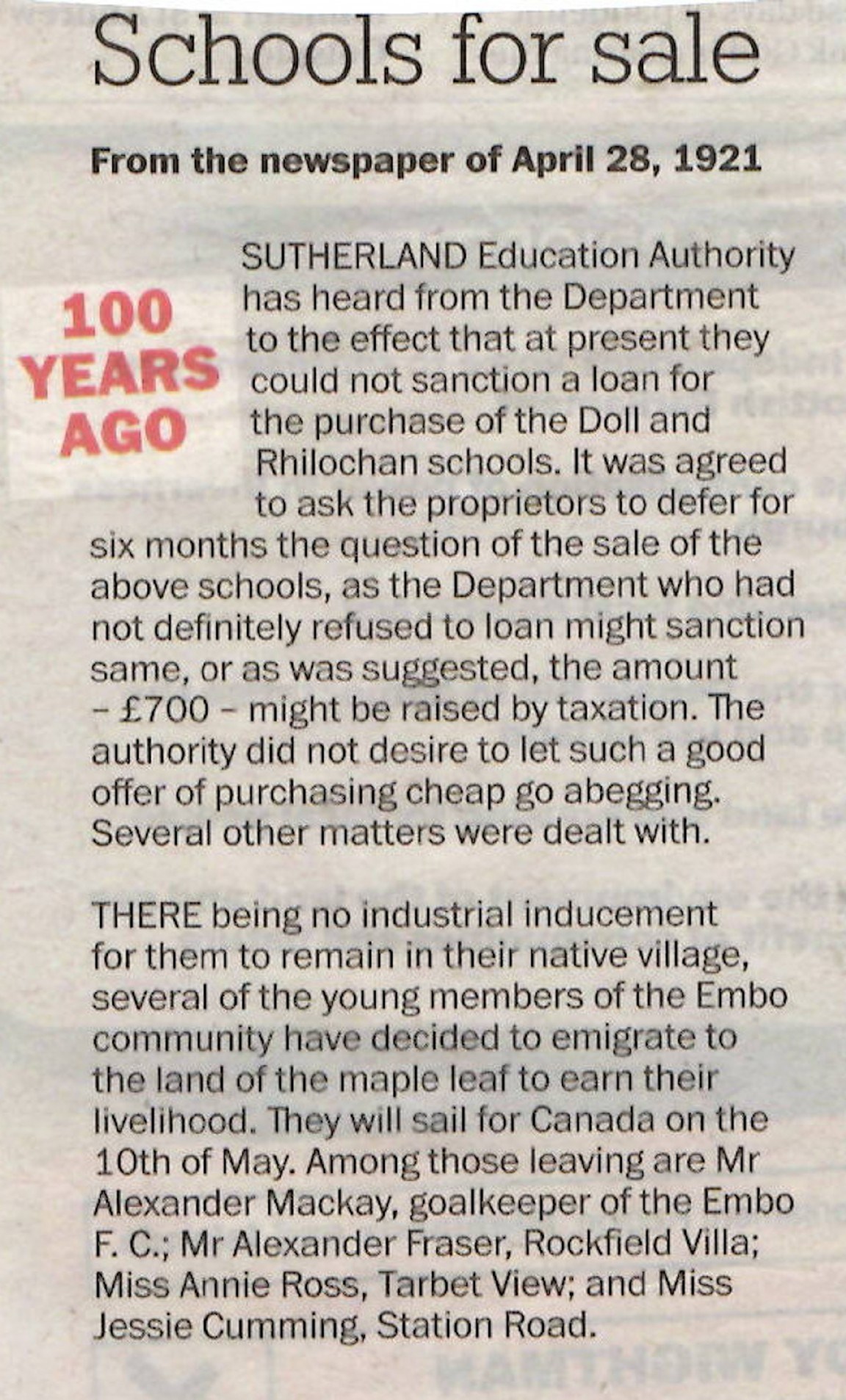 Third of a series of extracts from the Northern Times (Times Past) - 'Schools for sale' refers to the purchase of schools at the Doll and Rhilochan.