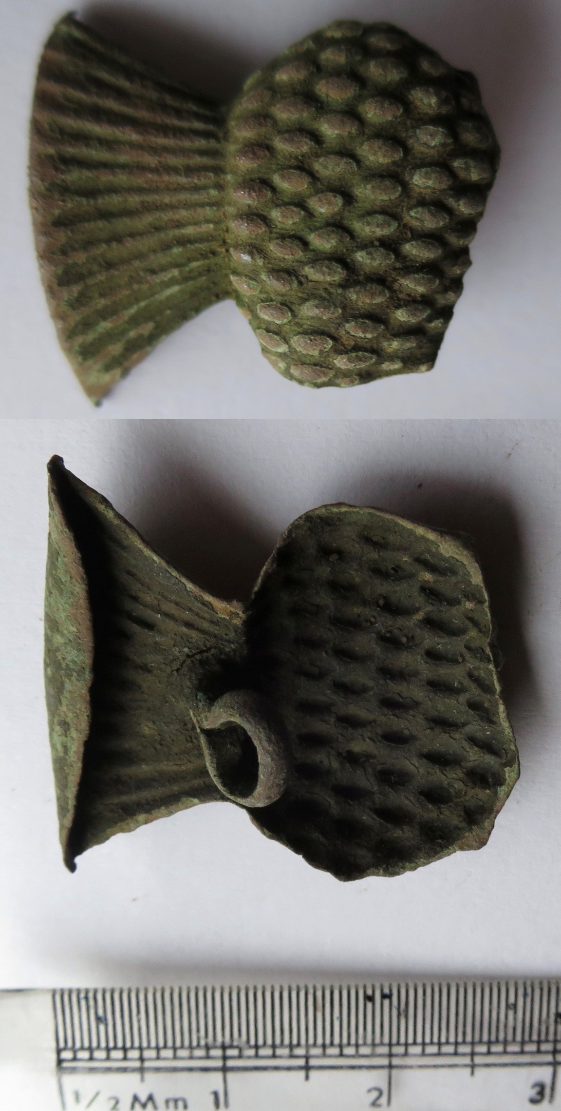 A metal button in the shape of a thistle discovered by metal detectorist at the Meadows Park, Dornoch.