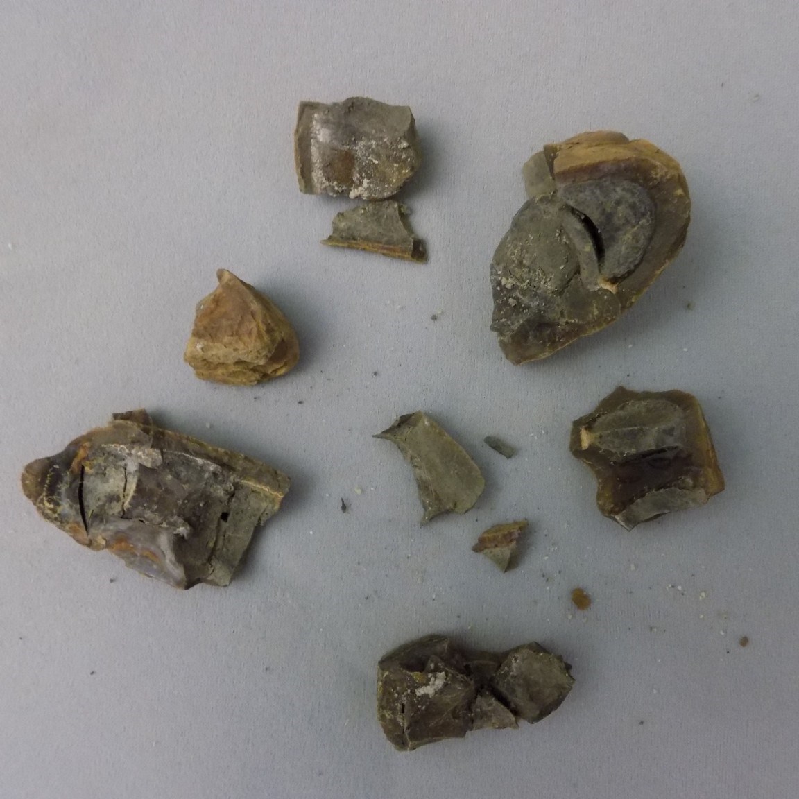 Ten fragments of varying size of a prehistoric firestone, found by Struan Robertson in Camore