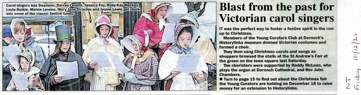 Cutting from the Northern Time of 10th December 2021 'Blast from the past for Victorian carol singers' with a report of the young curators singing carols on e Cathedral Green during the community market on 4th December 2021