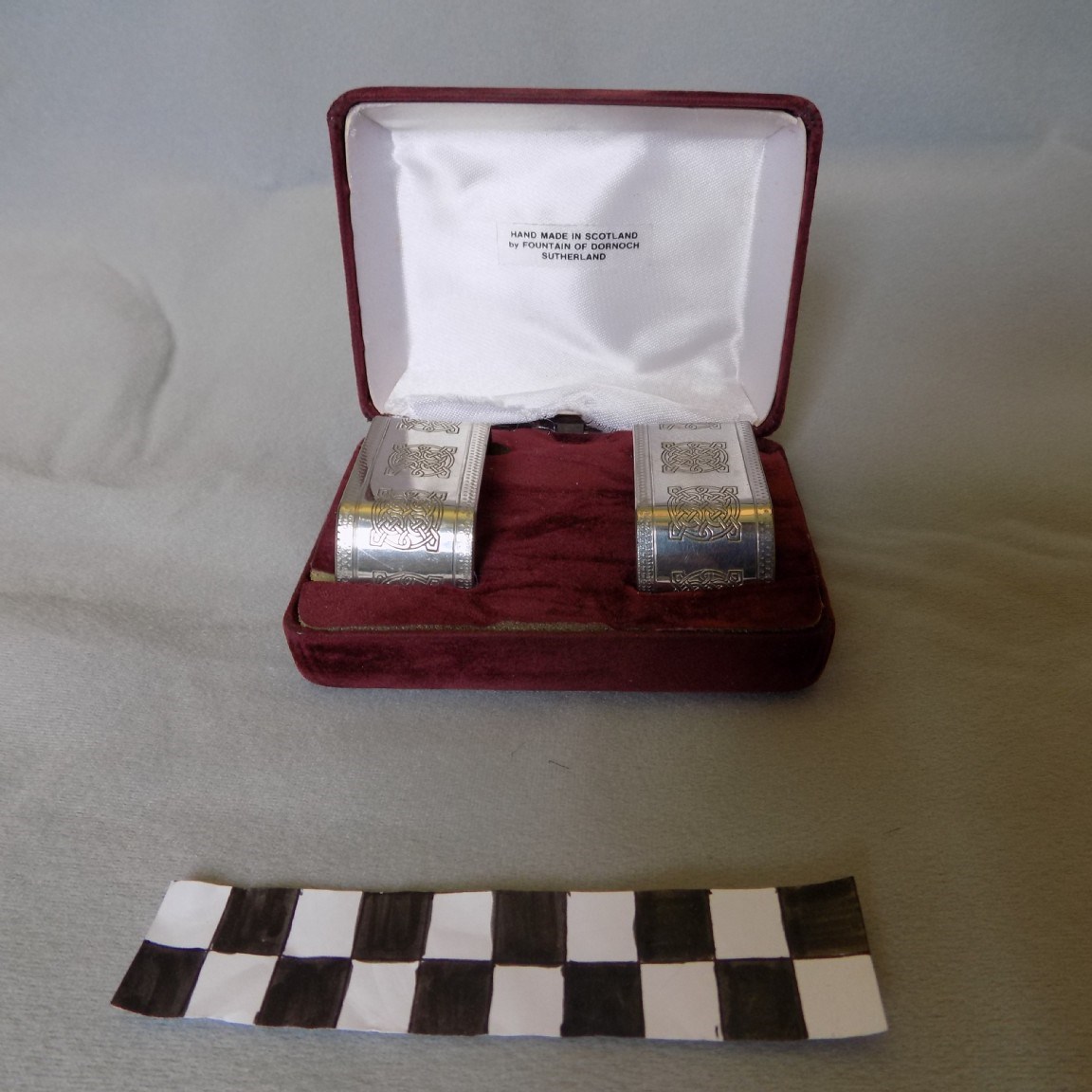 A set of two napkin rings with Celtic cross design, 'Hand made in Scotland by Fountain of Dornoch Sutherland', and displayed in a burgundy velvet box.