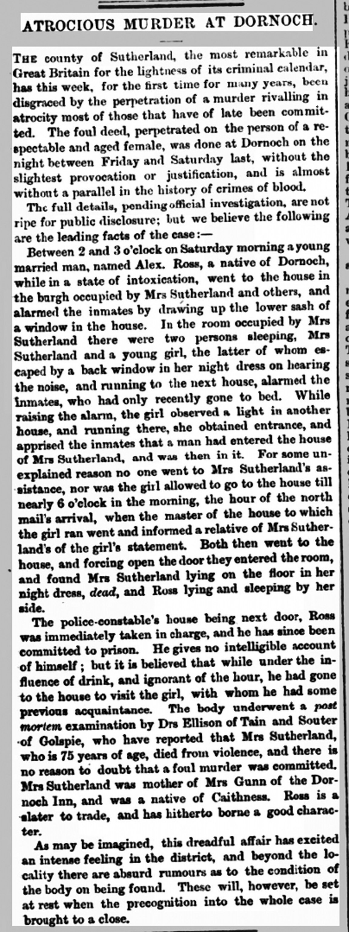 Newspaper article about a Dornoch murder in 1864 when tradesman, Alex Ross, killed Elizabeth Sutherland.