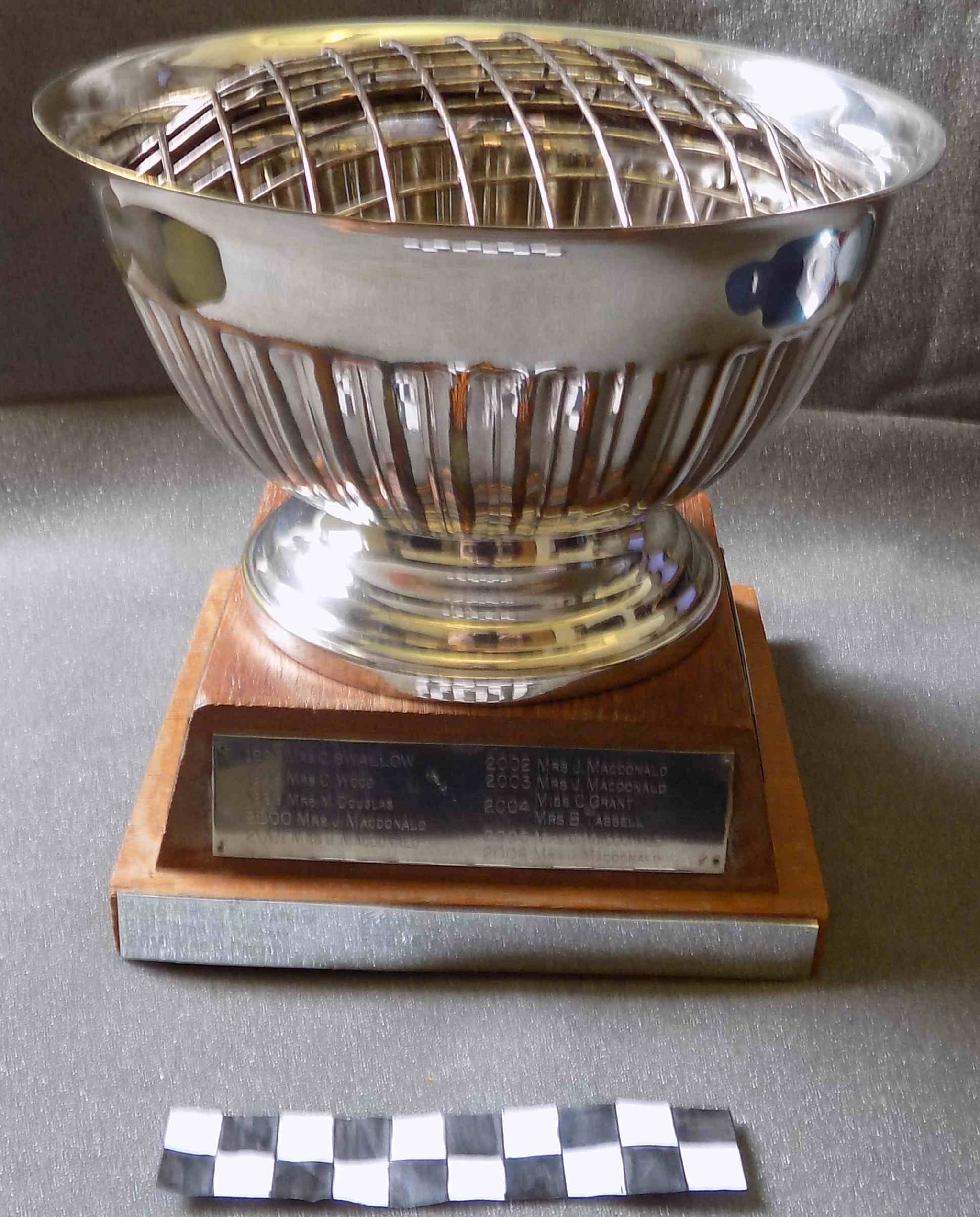 The Stewart Fitzroy Rosebowl, the first in a collection of Dornoch Scottish Women’s Rural Institute (SWRI) artefacts and documents entrusted to the care of Historylinks Museum following the closure of the Dornoch SWRI in 2021. The silver rose bowl, height 115 mm and diameter 175mm is mounted on a wooden plinth with silver plate bearing the names of the winners 1975 to 2020. There are minor scratches, dents and some tarnishing but overall the condition is fair. (SWRI Trophies Agreement and Artefacts Condition Check 21 April 2022 see /museum pdf/Validations}