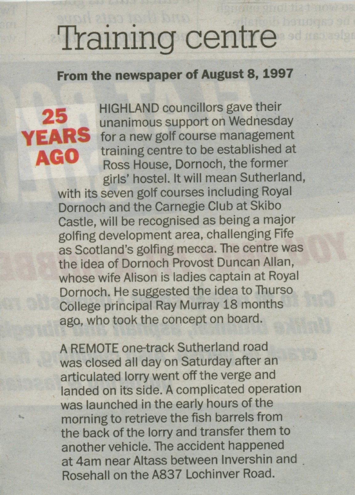 Cutting from the Northern Times of August 2022 (25 Years Ago - August 8 1997) with a report of Highland Council giving unanimous support for a new Golf Course Management Training Centre to be established at Ross House, the former girl's hostel.