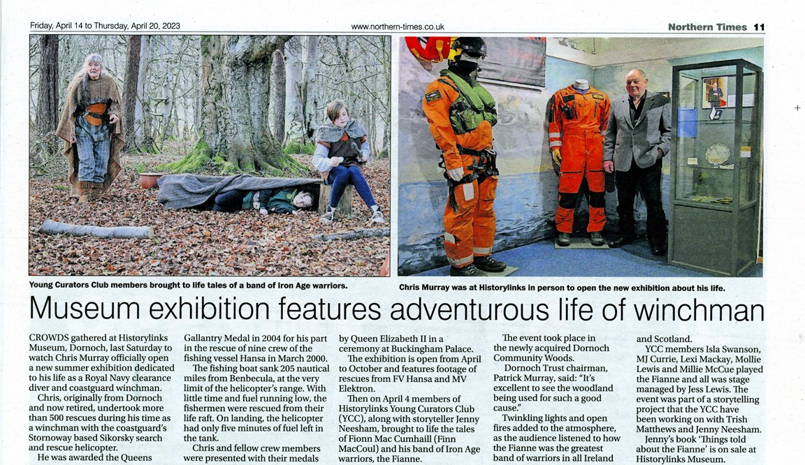 'Museum Exhibition features adventurous life of winchman' is an article relating to the opening of the Historylinks Summer Exhibition on 1 April 2023 about the life of Chris Murray QGM, Winchman, HM Coastguard, Stornoway.