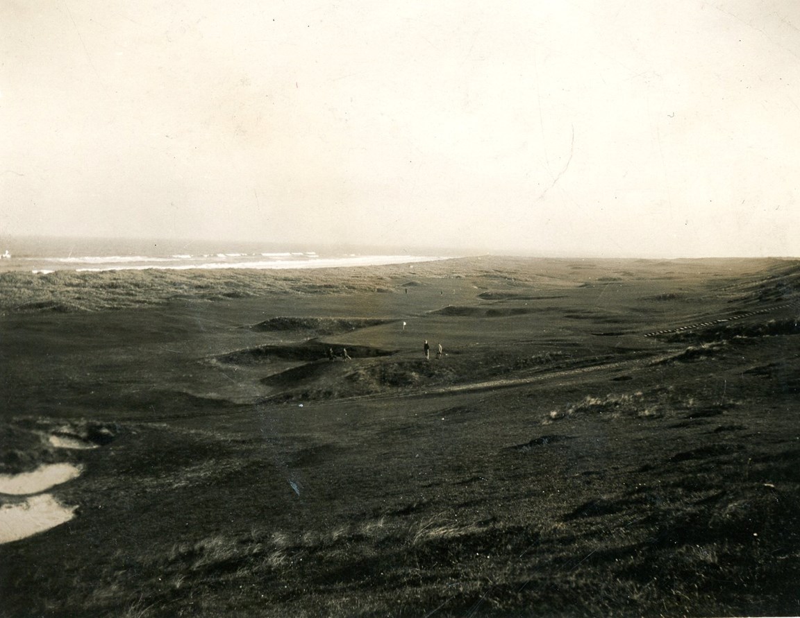Monochrome photograph of Royal Dornoch Golf Course taken from the hill top along the fifth fairway about 120 yards from the tee looking towards the 4th green.